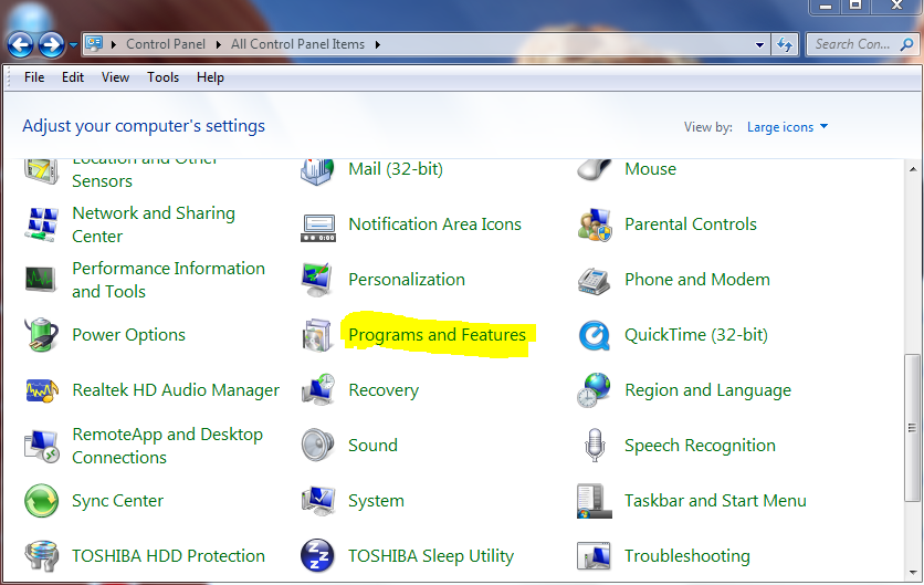From your computer desktop, click the “Start” button then “Control Panel”, then “Programs and Features” (Windows Vista/7) or “Add/Remove Programs” (Windows XP)