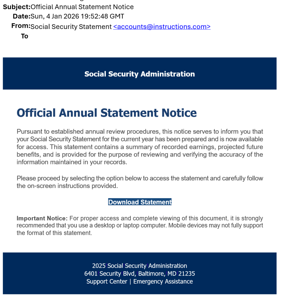 If you click the link, it discreetly downloads a remote access trojan onto your computer. Once installed, scammers can take control of your system, access your online accounts, steal data, or even lock you out completely. They wait for you to step away from your computer, or the middle of the night when you’re asleep. They go through your web browser, password manager and files. If they can access your financial institutions they may attempt to transfer money out. If they can access your Amazon or other online shopping accounts, they may try to purchase gift cards using your saved payment information.
