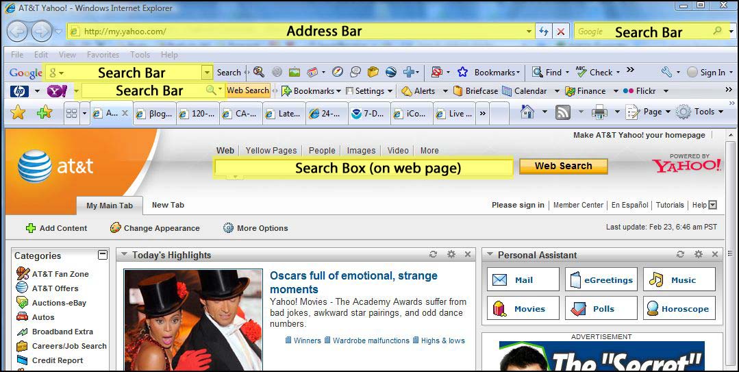 A search box on a web page is similar to the search bar, but it will give you search results based on the internet search provider that is used by the web page. For example if you are on the AT&T home page (http://att.yahoo.com), anything you type in the search box on the web page will bring up internet search results provided by Yahoo. Charter’s home page brings up Google search results, as does AOL.com.