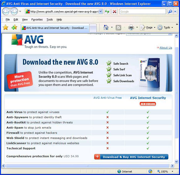Advertisements in AVG Anti-Virus Free Edition have recently began promoting their new AVG Internet Security 8.0. In my opinion most people don’t need the additional features that AVG Internet Security 8.0 provides since most of the additional features are redundant or free from other sources. I list specific examples below, as well as a screen shot of the AVG website which compares the free and paid versions.