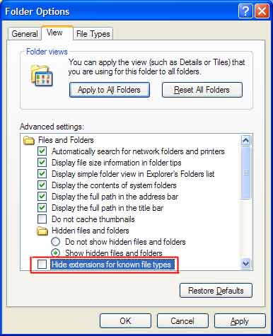 Viruses that are sent as attachments generally have filename extensions of .vbs, .bat, .exe, .pif and .scr. But since Windows by default hides those extensions – an innocent file of what may appear to be a picture (such as ournewbaby.jpg), may actually be a virus with a filename of ournewbaby.jpg.exe – again by default Windows hides the “.exe” part of the file name. To change this default setting in Windows XP go to My Computer > Tools > Folder Options… and click on the View tab. Uncheck Hide extensions for known file types as shown below.