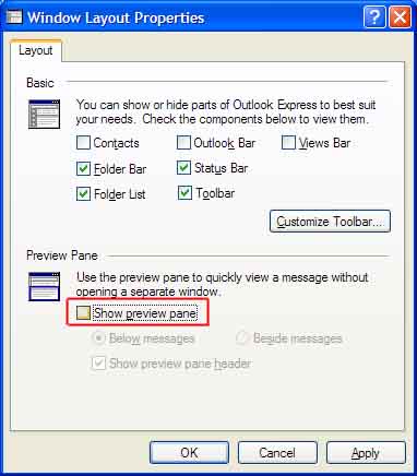 - In Outlook Express go to View and select Layout… then deselect Show preview pane as shown below.