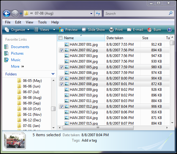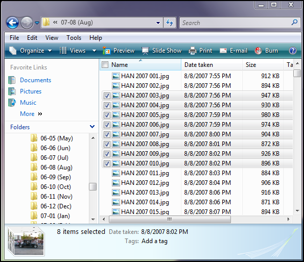 In the example below I have selected a range of picture files by clicking on the first item, then holding down “Shift” while clicking on the last item. I could then copy the selected pictures, move them, delete them, etc.