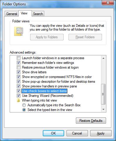 In the examples above, with Windows Vista you can also select multiple items by clicking on the check boxes to the left of the file name. Check boxes are turned off by default in Windows Vista but can be turned on in the Folder Options Control Panel as shown below…